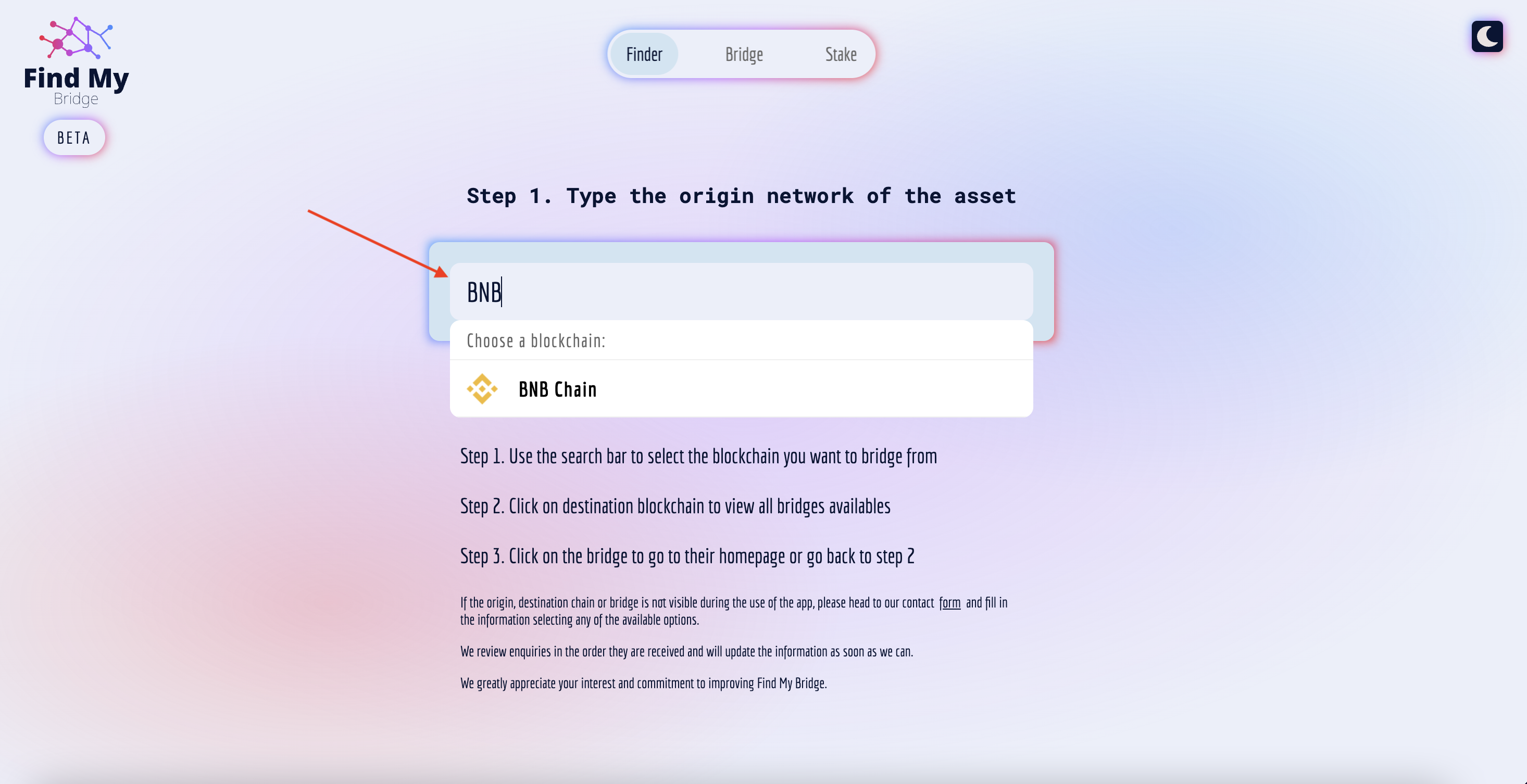 Find My Bridge blockchain bridge finder is a web-based application that allows users to search for bridges that connect different blockchain networks. The application provides a user-friendly interface that allows users to search for bridges by selecting a specific blockchain network. Once a bridge is found, the application provides information about the bridge, including the name of the bridge, fees and other relevant information.
