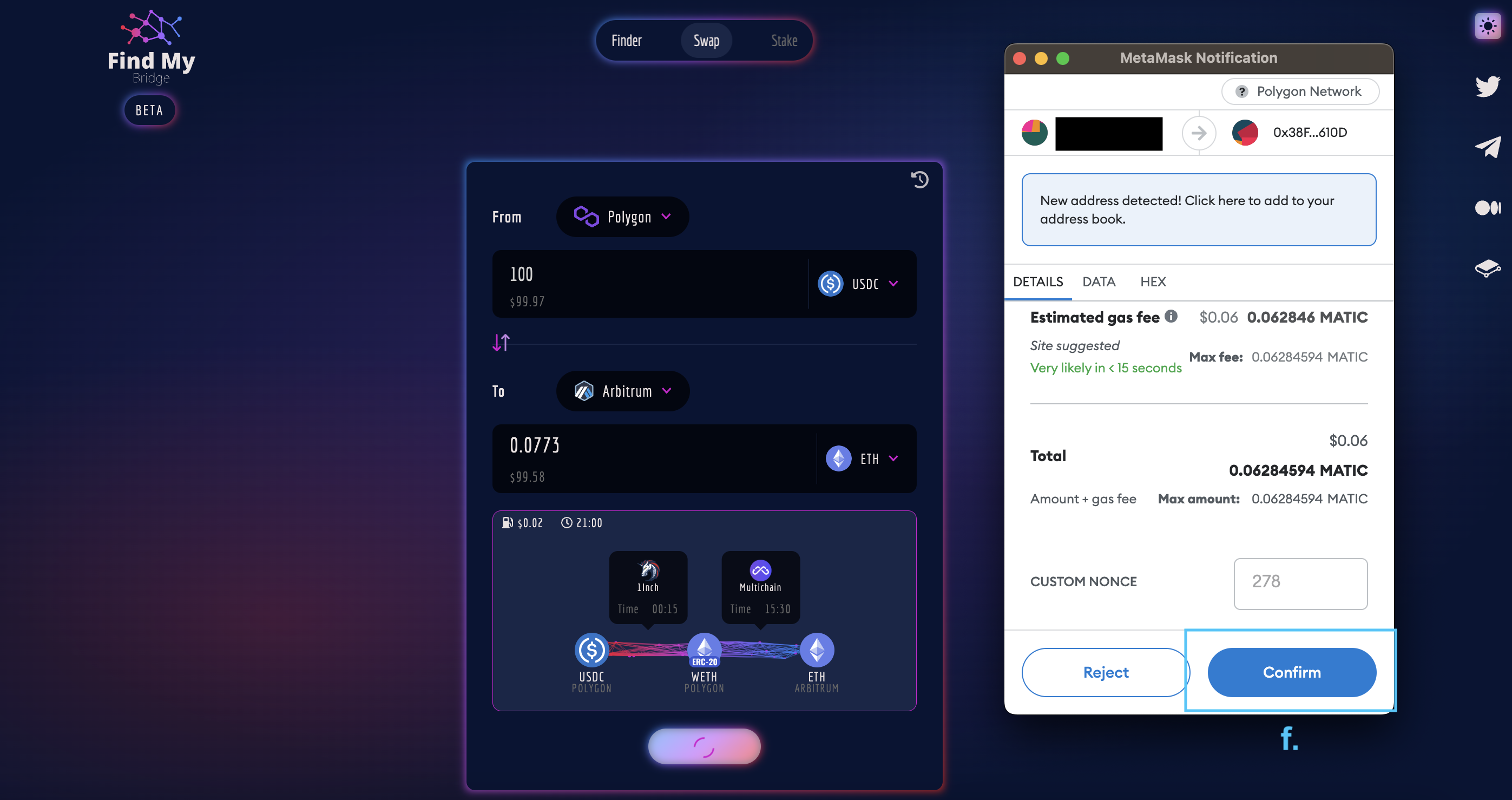 Click "Swap" and sign both the token approval (this is required to transfer the asset from your wallet) and the transaction (f).